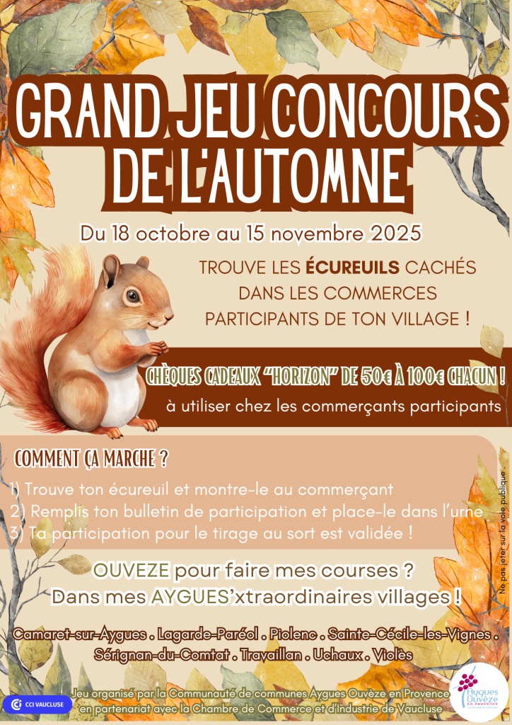 Du 18 octobre au 15 novembre 2025, la Communauté de communes Aygues Ouvèze en Provence, en partenariat avec la Chambre de Commerce et d’Industrie de Vaucluse, organise son grand jeu concours de l’automne.